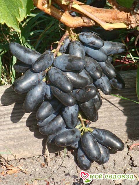 Виноград Кишмиш Черный палец, Блек-фингер — безсемянный кимишный сорт винограда среднего срока созревания (120 — 125 дней) с высокими вкусовыми и товарными характеристиками. Кишмиш Чёрный палец выведен в Израеле. Куст большой силы роста. Цветок обоеполый. Грозди крупные, средней плотности, массой 700-1500 г, конической формы. Ягоды винограда крупные, массой 8-12 г, размером 40х18мм, пальцевидной формы, практически черной окраски. Кожица средней толщины, при еде не ощущается. Мякоть мясистая, хрустящая, приятного гармоничного вкуса. Сахаристость в ягодах очень высокая. Нагрузка на куст 30-35 глазков. Обрезка лоз плодоношения на 6-8 глазков. Морозостойкость -22 С. Устойчивость к заболеваниям на уровне 3,5 баллов. Виноград Кишмиш Чёрный палец для центральной и северной части Украины укрывной на зиму. Корнесобственные саженцы винограда. Магазин Мой Садовод, рекомендации по уходу Уход за виноградом сводится к регулярным поливам в сухую погоду, подкормкам и формированию куста. Для подкормки используют минеральные и органические удобрения (перепревший навоз, компост). Ранней весной кусты виноград поливают полным минеральным удобрением, растворенным в воде, перед цветением такую подкормку повторяют. Перед созреванием вносят фосфорно-калийные удобрения, а после сбора урожая проводят подкормку калием для повышения зимостойкости растений. Кроме того для лучшего вызревания лозы рекомендуется удаление пасынков и прищипывание верхушек в начале сентября. Формирование куста Винограда. Для формирования виноградных кустов необходимо установить надежную опору. Самая простая представляет собой два столба с несколькими рядами проволоки между ними. По мере роста побеги подвязывают к проволоке, задавая им нужное направление. Формирование куста винограда начинают с первого года, оставляя не более двух здоровых побегов у основания, остальные выламывают. На второй год на кусте оставляют по три почки на каждом побеге, на третий год на каждом плече оставляют 2-3 сильных побега, остальные удаляют. Пожалуйста, помните, что транспортировка и пересадка — стресс для растения. Перед высадкой в открытый грунт обработайте корневую систему стимулятором роста. С заботой о растениях, Мой Садовод. В нашем интернет-магазине вы сможете купить Кишмишные сорта Так же возможно вас заинтересуют Виноград Осенний крупноплодный и Виноград Катавба .